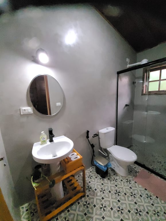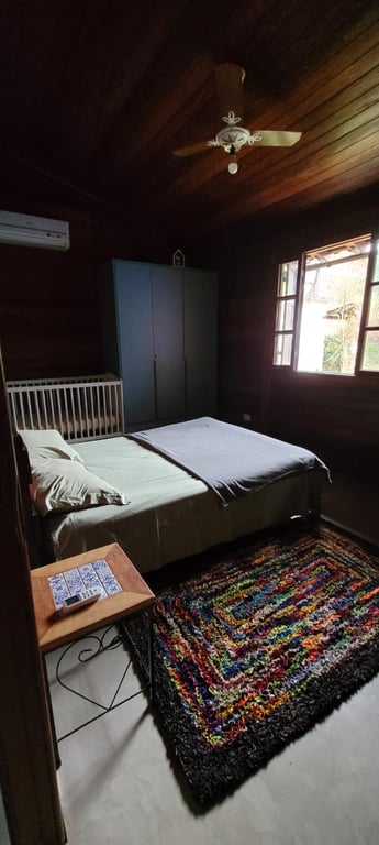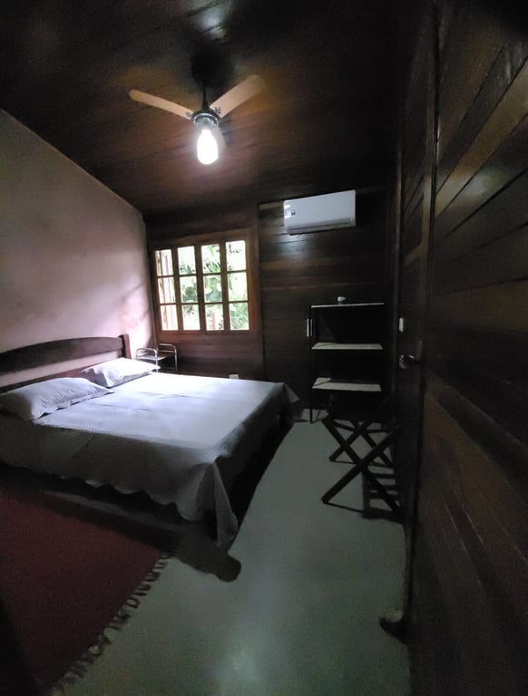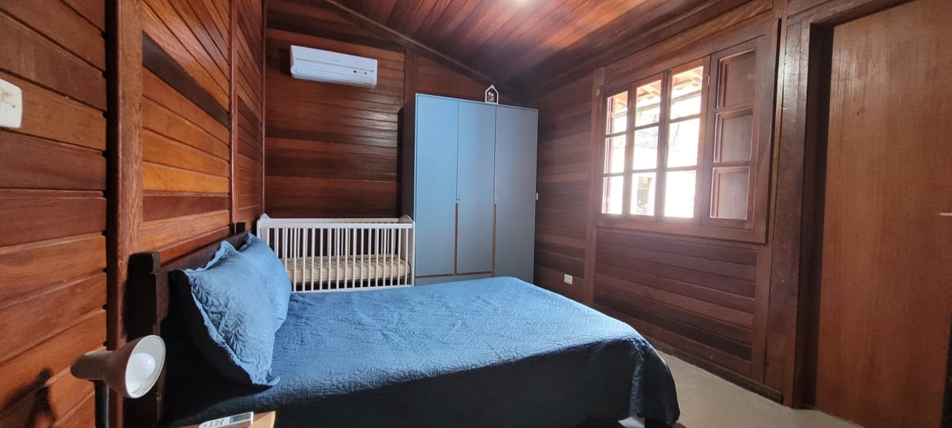 A casa tem 3 quartos, sendo duas suítes com cama de casal (uma delas tem um berço) e um quarto social com 1 cama de casal e uma de solteiro com bicama e um banheiro social. Acomoda até 08 pessoas em cama e 01 bebê no berço. Todos os quartos possuem ar condicionado.