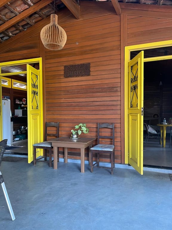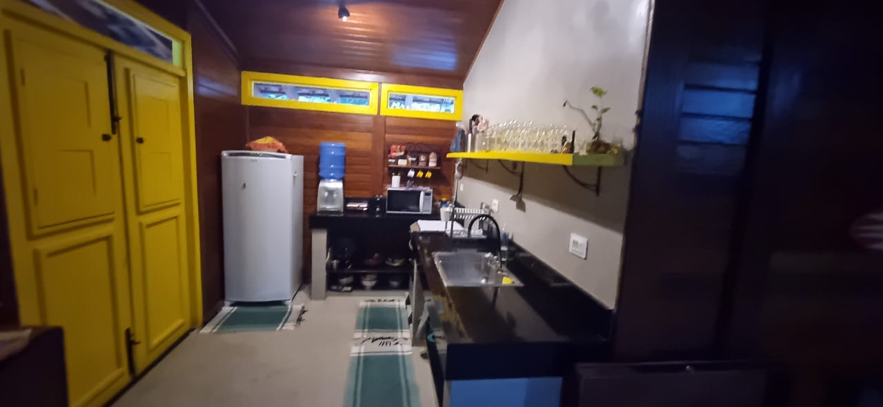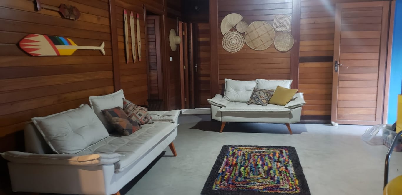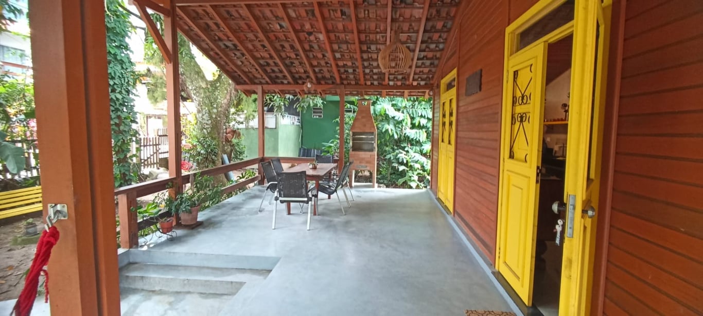 Possui cozinha americana completa, com mesa interna de 04 lugares e externa na varanda à frente da cozinha de 06 lugares e ampla sala com televisão e dois sofás. Temos uma churrasqueira na varanda frontal da casa!