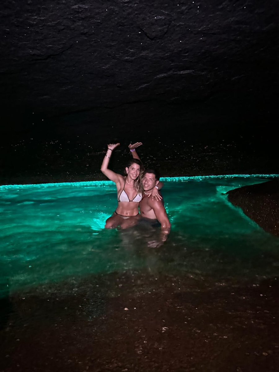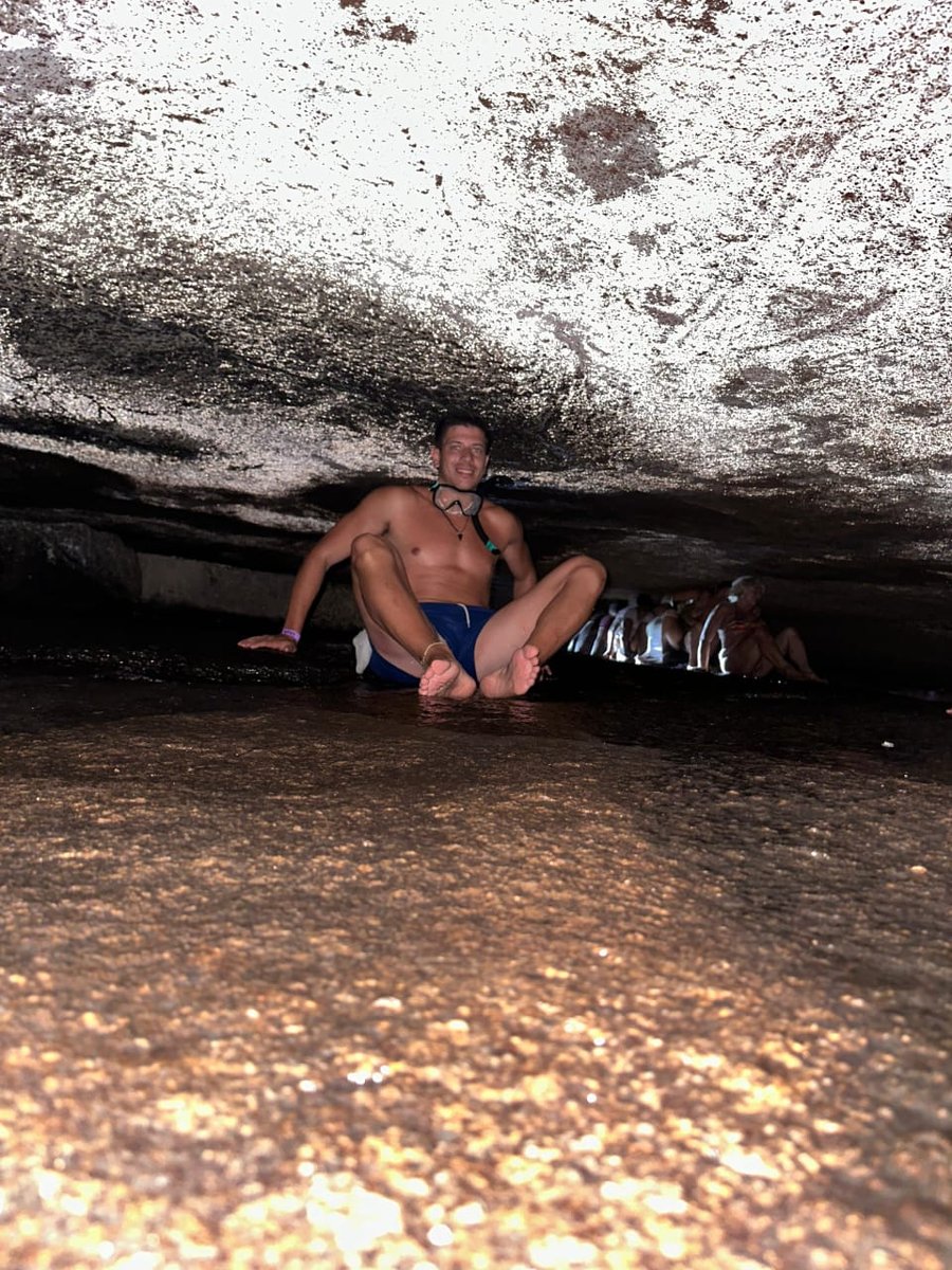 há uma praia de pedra subterrânea. A luz solar, propagada na água forma o